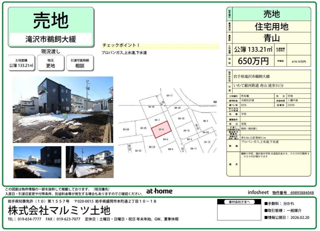 滝沢市鵜飼大緩 売地 650万円